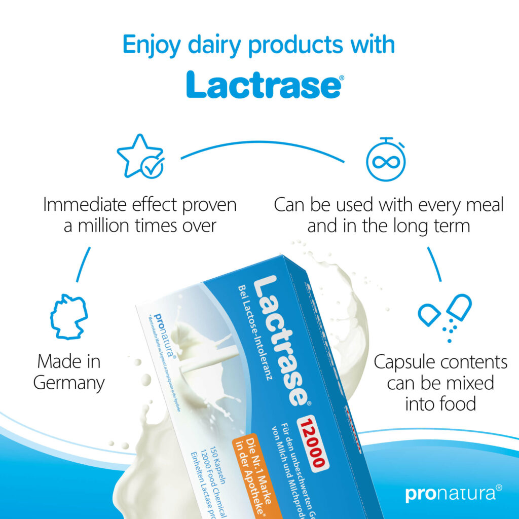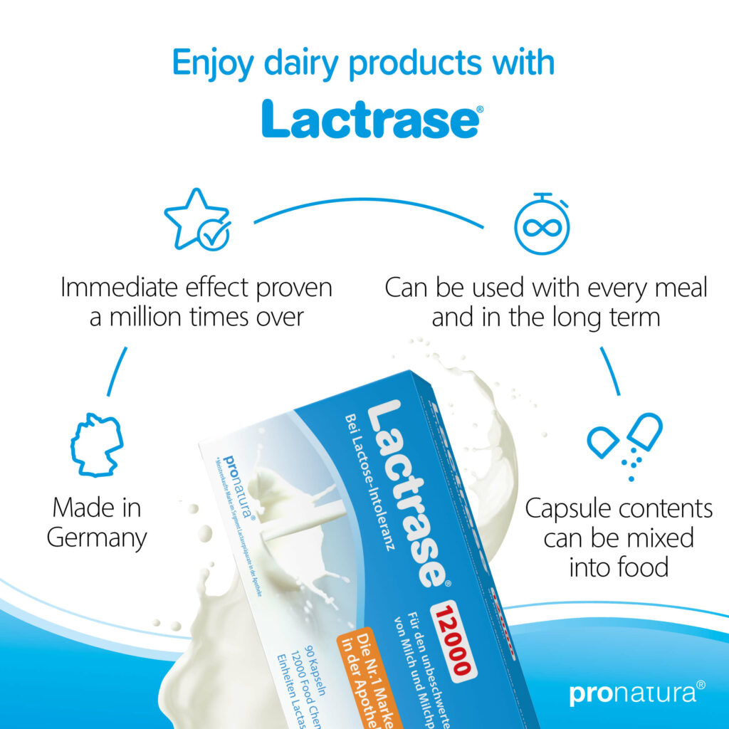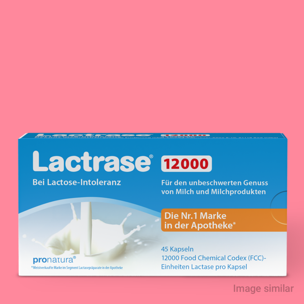 The activity of the lactase contained in Lactrase® is expressed in FCC units. The higher the FCC units, the more active the lactase – and the more lactose it can break down. According to a recommendation from the European Food Safety Authority (EFSA), at least 4500 FCC units of lactase should be consumed with each meal containing lactose. However, you should test for yourself what amount of Lactrase® is sufficient for you. This depends in particular on how much lactase your body produces itself and on the amount of lactose contained in the meal.