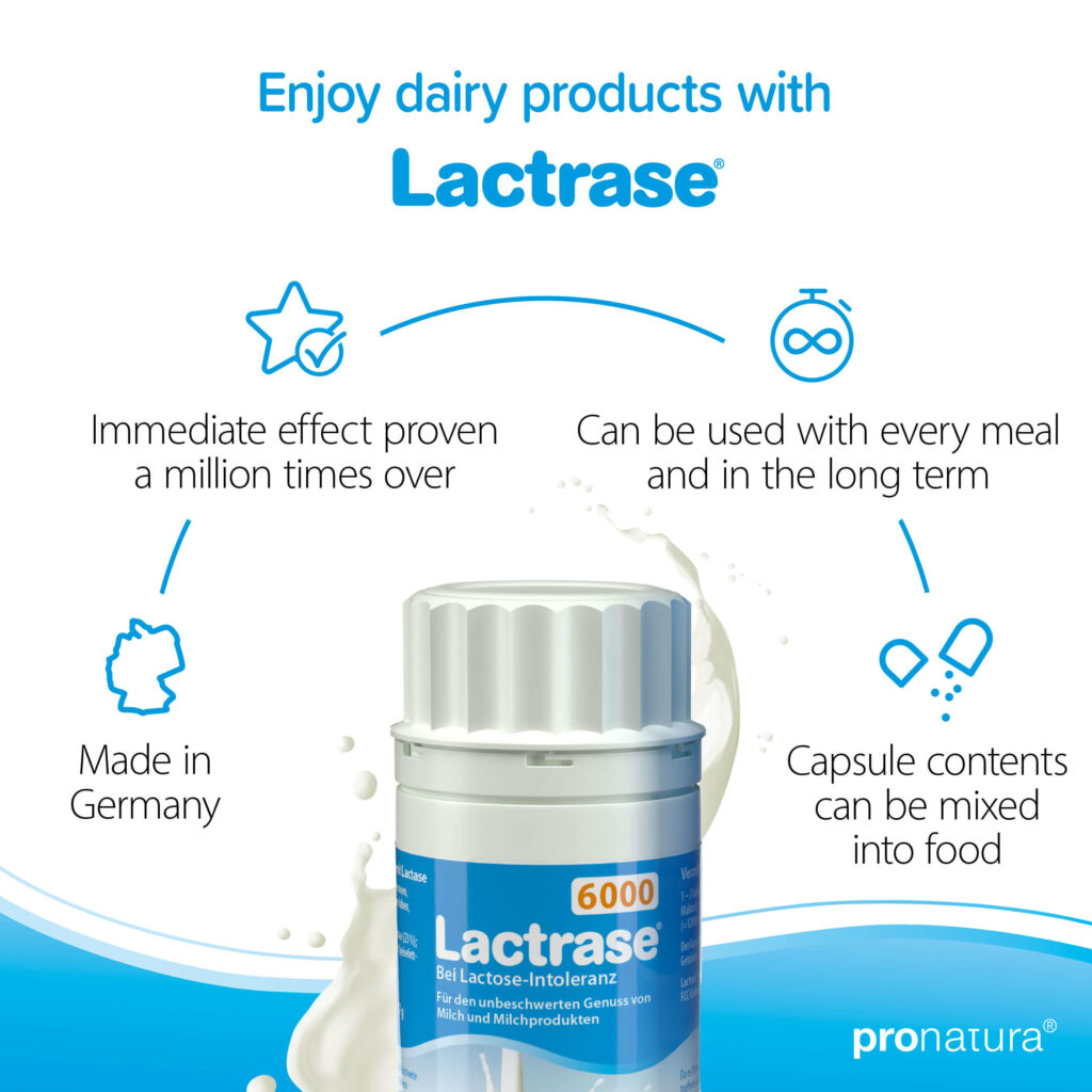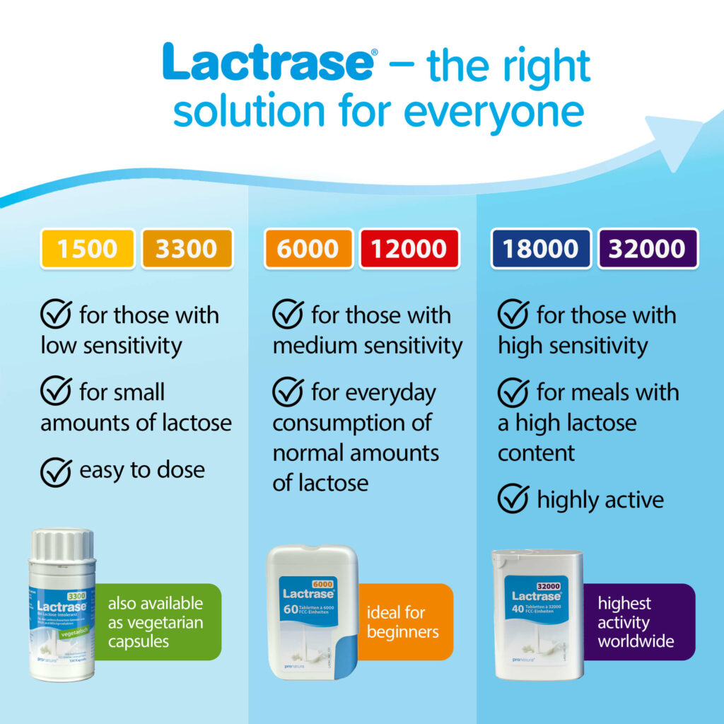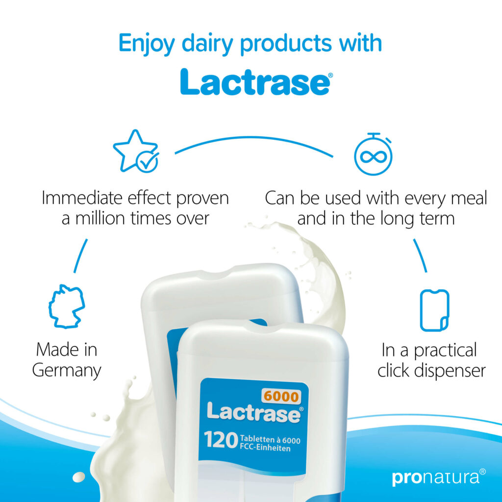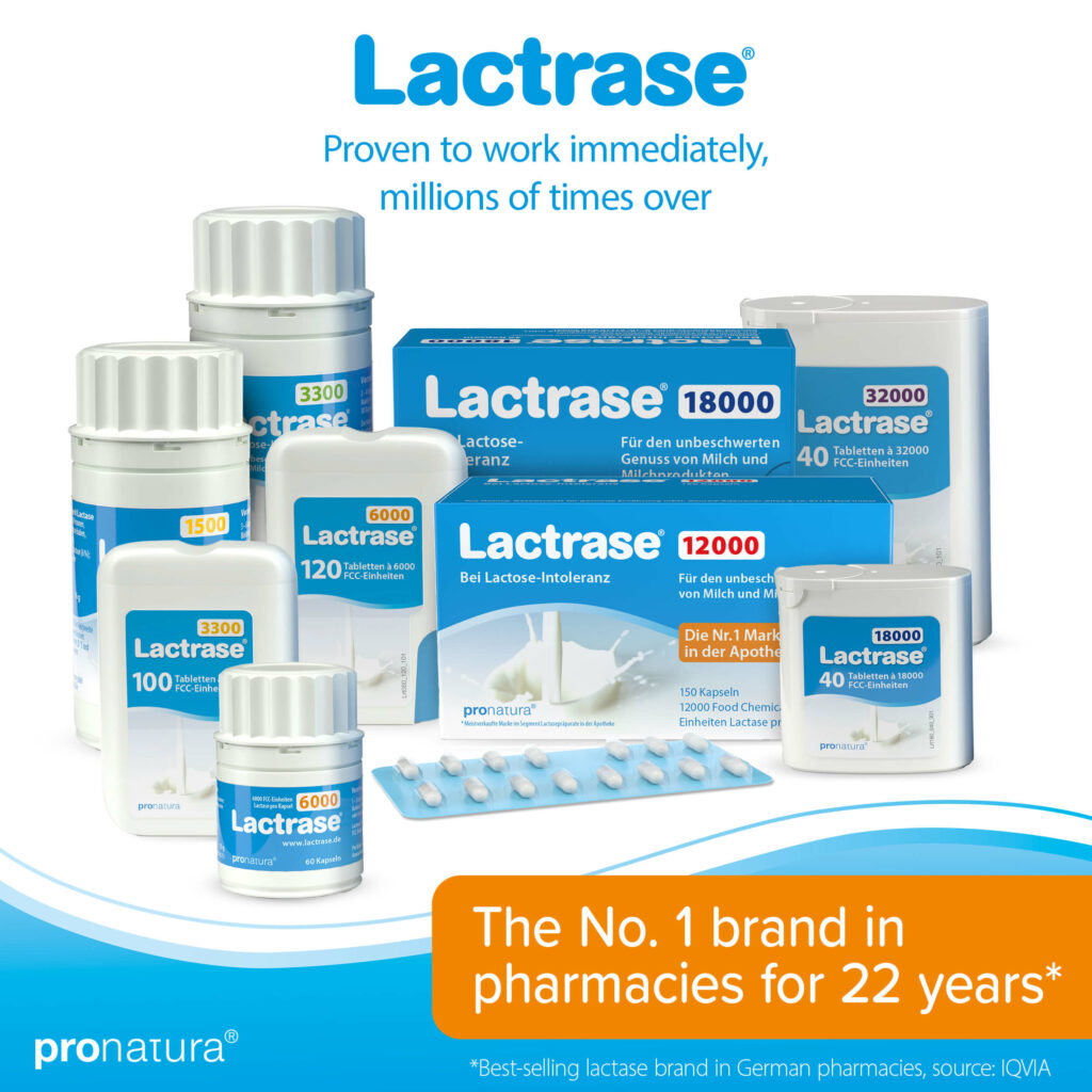 The activity of the lactase contained in Lactrase® is expressed in FCC units. The higher the FCC units, the more active the lactase – and the more lactose it can break down. According to a recommendation from the European Food Safety Authority (EFSA), at least 4500 FCC units of lactase should be consumed with each meal containing lactose. However, you should test for yourself what amount of Lactrase® is sufficient for you. This depends in particular on how much lactase your body produces itself and on the amount of lactose contained in the meal.